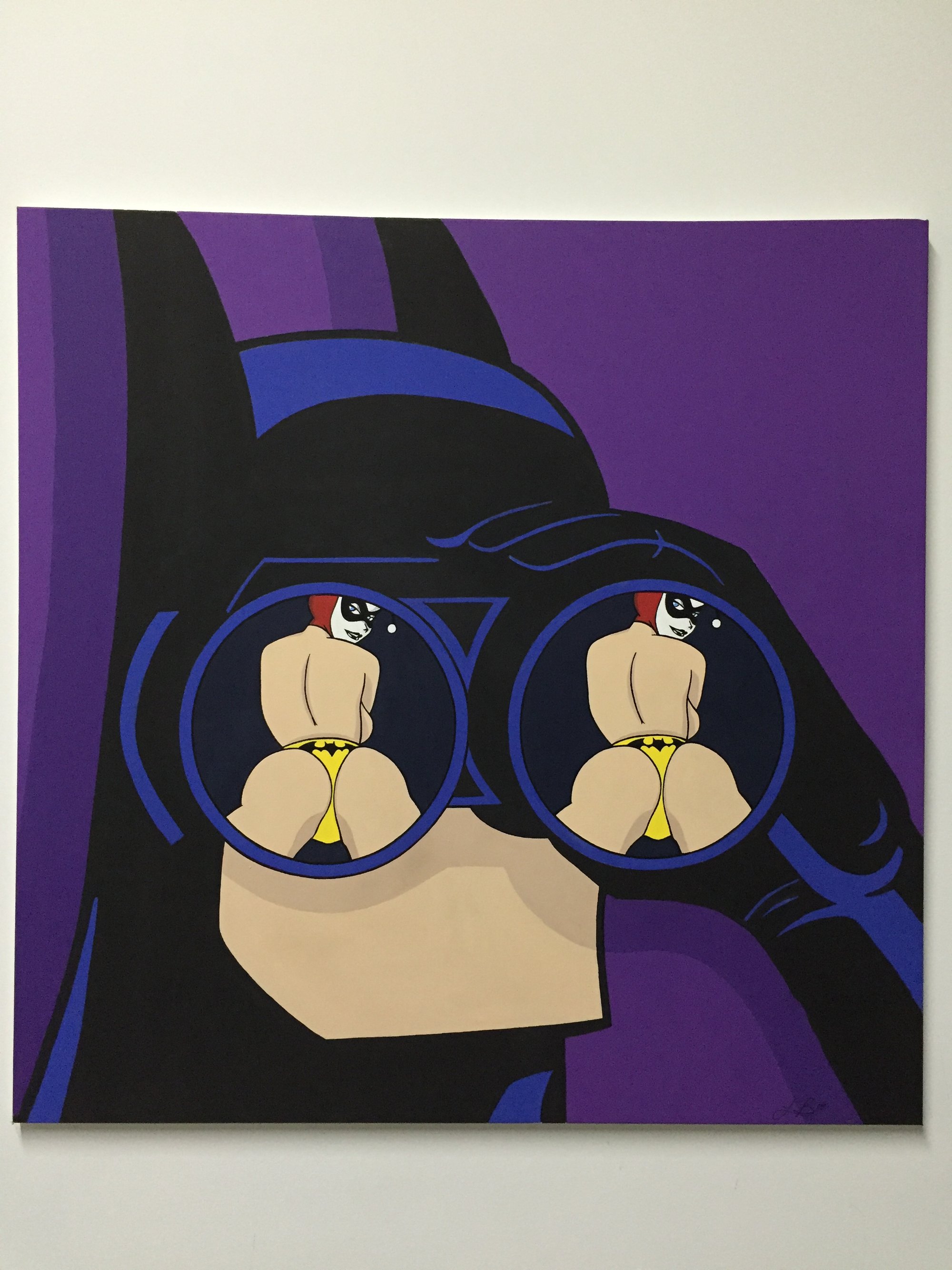 "BAT That Thang Up" is an original painting I did in the fall of 2015 based on the characters of Batman and Harley Quinn from the Batman: The Animated Series of 1990s lore for an event called Sounds & Colors I held at my showroom in Downtown LA, crafted with Delta Creative Ceramcoat acrylic paint on a 24x24 and 36x36 BLICK Studio Traditional Profile Stretched Canvas.
