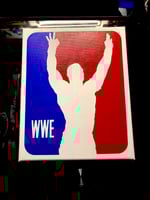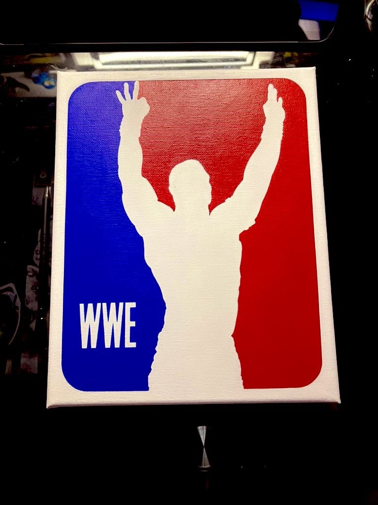 Acrylic painting of an Art By Association mash up of John Cena, the never seen, 17 time world champ and future hall of famer, hitting one of his signature poses from the top rope, as a NBA logo.