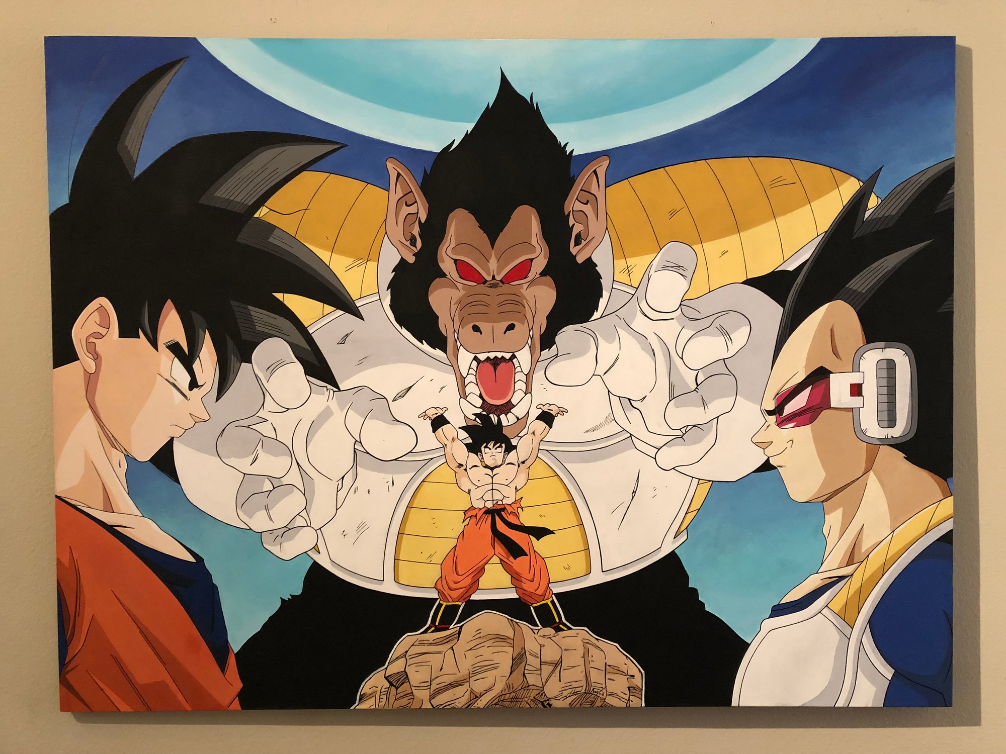 Acrylic painting of an Art By Association mash up of one of the earliest battles in Dragon Ball Z history between Goku and arch rival turned frenemy Vegeta highlighting one of the greatest moments between the two. Painted on a 24x36 Artist Canvas and 24x36 Gallery Wrapped Canvas with Acrylic Paint.