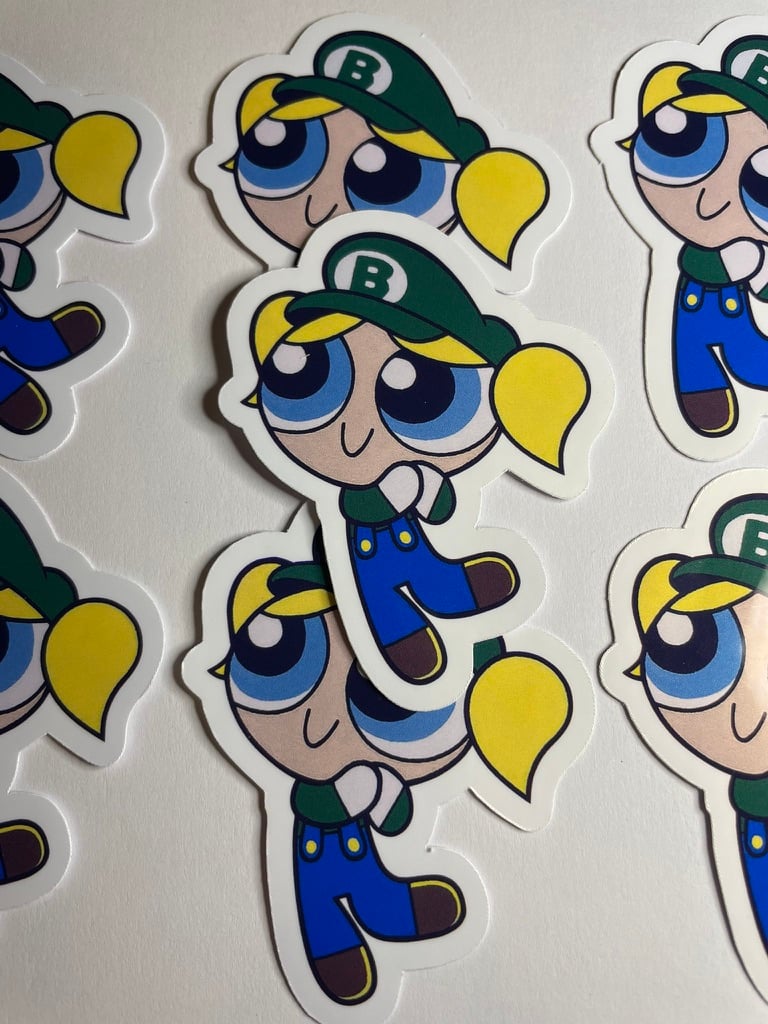 A sticker from a crossover acrylic painting inspired by both the Powerpuff Girls and the Super Mario Bros. on a 18x24 canvas crafted with Delta Creative Ceramcoat acrylic paint. Stickers are 2.5" die cut waterproof.