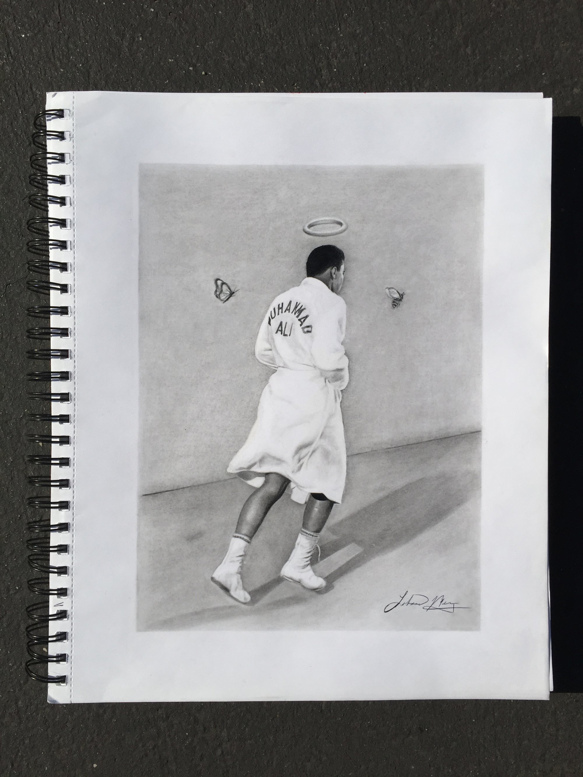 A drawing created in dedication for the legend that is Muhammad Ali, the greatest of all time. Created with graphite mechanical pencil, pen, marker, and a white charcoal on 11x14 paper.